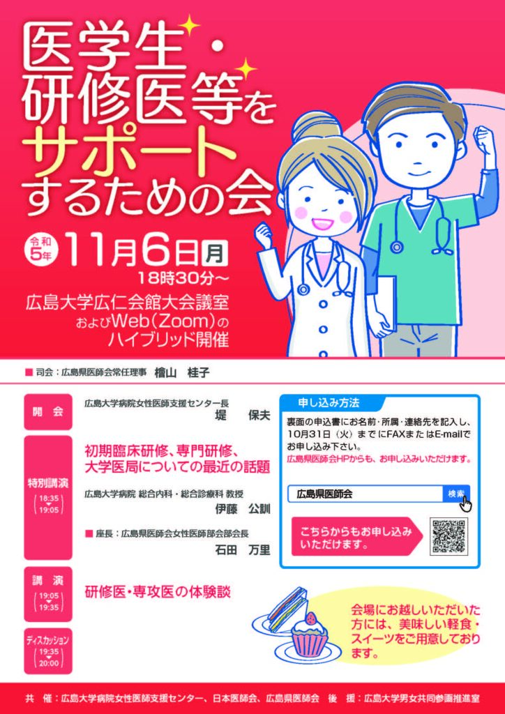 今年度から新型コロナウイルス感染症流行以前の開催形態に戻した。お茶・コーヒーやケーキを飲食しながらの現地開催を行った。あらかじめ参加予定の学生から話を聞いてみたい、興味のある科や質問内容を収集し、なるべくそれに応えられるように対象の医師に積極的に声をかけた。はじめに、HUH(Hiroshima University Hospital)活躍支援助成を受けた2 名の医師から、研究内容や成果、子育てをしながら臨床・研究を行う工夫などの発表があり、様々な苦労がありながらも努力し、楽しく子育ても研究も行なっていることが話された。次に、広島大学病院女性研究者奨励賞を受賞された2 名の医師から、研究内容などの発表があり、学生も興味をもって耳を傾けていた。引き続いて茶話会とし、いくつかのグループにわかれ、それぞれのテーブルでの自由交流を行った。