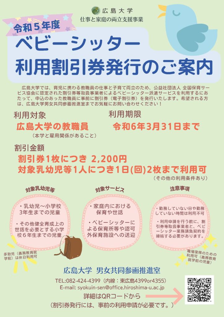 https://jpn01.safelinks.protection.outlook.com/?url=https%3A%2F%2Fwww.hiroshima-u.ac.jp%2Fgender%2Fworklife%2Fbaby-sitter&data=05%7C01%7Cmari%40hiroshima-u.ac.jp%7C8102f3606d874fb8711308db5ffd0610%7Cc40454ddb2634926868d8e12640d3750%7C1%7C0%7C638209312558098959%7CUnknown%7CTWFpbGZsb3d8eyJWIjoiMC4wLjAwMDAiLCJQIjoiV2luMzIiLCJBTiI6Ik1haWwiLCJXVCI6Mn0%3D%7C3000%7C%7C%7C&sdata=6w1YEMsbZkkgwgMjkkWtyNyGEzPTwssab8BjcP6ljGM%3D&reserved=0