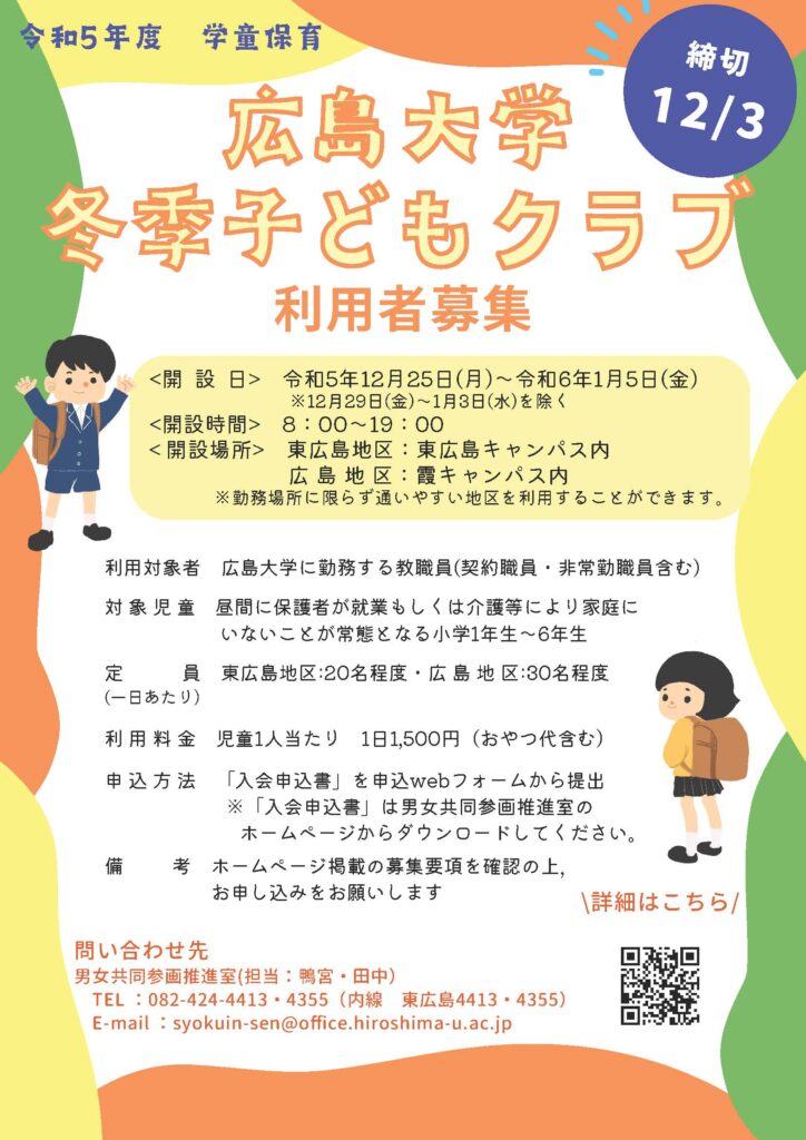 広島大学霞キャンパスでは、以下の期間において子どもクラブ(学童保育)を実施いたします。