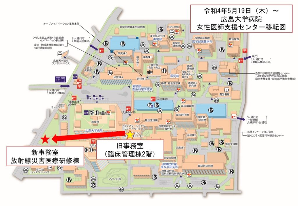 【学内外対象】女性医師支援センターの事務室が移転しました! Posted on 2022年5月20日 by 医療政策室 令和4年5月19日(木)より、広島大学病院女性医師支援センターは霞キャンパス内の別棟へ移転しました。詳しくは以下地図をご確認ください。 旧:臨床管理棟2階 医療政策室内 新:放射線災害医療研修棟3階 なお、電話番号およびメールアドレスに変更はありません。