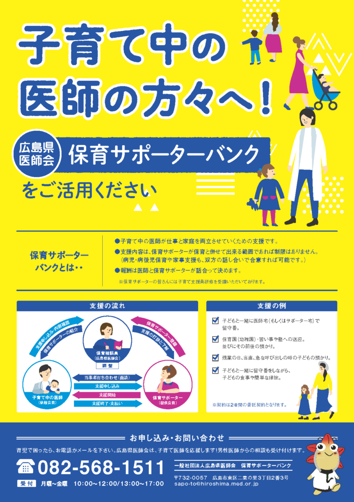 子育て中の医師が仕事と家庭を両立させていくための支援として、広島県医師会が保育サポーターバンクの運営を開始しました。